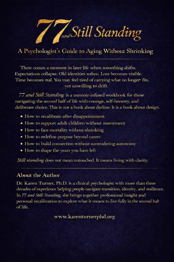 77 and Still Standing is a reflective and deeply human look at what it means to keep growing through every stage of life. Drawing on decades of experience in psychology, personal insight, and lived wisdom, Dr. Karen Turner explores resilience, change, faith, fairness, fatigue, and the quiet strength that comes with age. With honesty, warmth, and clarity, she speaks to the moments when life challenges us to adapt, forgive, and continue forward. This book is not simply about getting older, it is about standing, learning, and living with purpose no matter what season of life you are in.